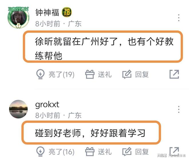 徐昕在“新东家”如鱼得水,也让支持他的网友欣喜万分,纷纷表示“你看看人家”;“遇到恩师了,而不是那种作秀表面一套背后一套的那种教练,好好加油。”;“要是打出来,杜峰耽误他就实锤了,希望徐昕争气”;“徐昕就留在广州好了,也有个好教练帮他”;“碰到好老师,好好跟着学习”……