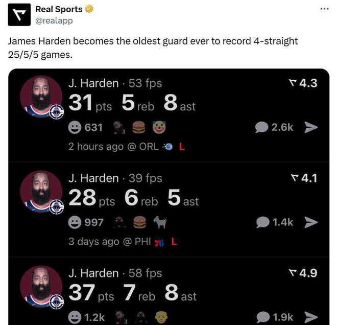 本场也是36岁零87天老哈登连续第4场至少拿到25+5+5数据,成为NBA历史上交出这一表现最老的后卫。