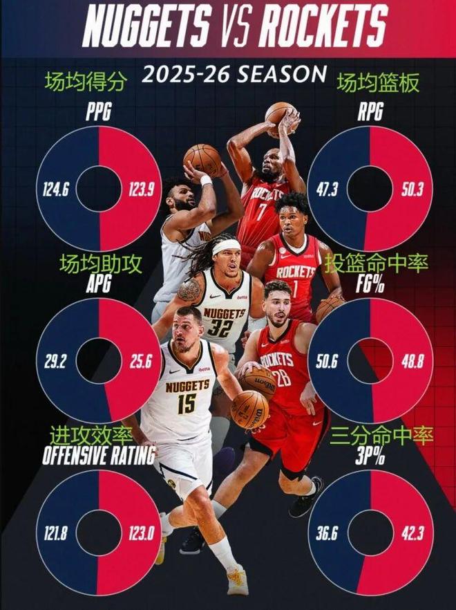 火箭篮板、进攻效率、三分命中率占优,掘金得分、助攻、投篮命中率战优,两队平分秋色。