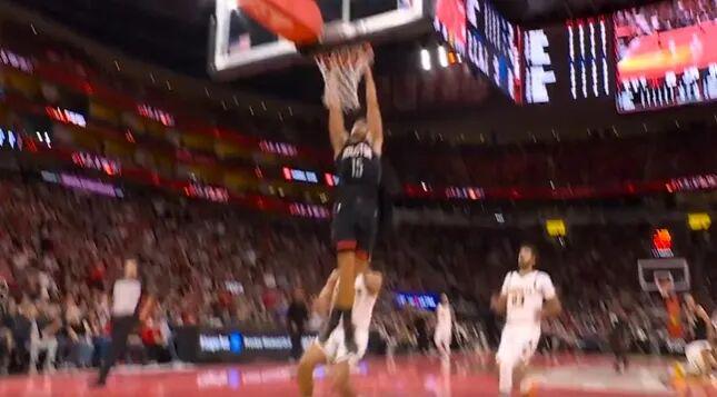接申京倒地抢断后的不看人助攻,快攻双手爆扣打停掘金