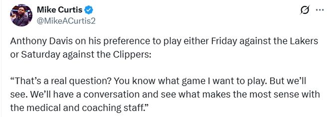在连续休整两晚后,独行侠队将前往洛杉矶开启背靠背赛程,分别于北京时间周六对阵湖人、周日对阵快船。由于左小腿拉伤自10月30日起便缺席比赛,浓眉不会被允许连续出战这两场赛事。球队计划观察他周五的身体状态,再决定他将出战周六还是周日的比赛。