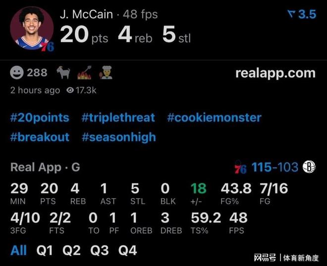你说,我们还能看到当年那个在印城横刀立马、威风凛凛的乔大将军吗?除了半场的这比赛还有好多看点呢,咱们就拭目以待吧!嘿呀,您瞧瞧76人这边,今儿个可又冒出个“魔仙小哥”呢!还记得去年一开场就像开了挂,打出最佳新秀风采的麦凯恩不?嘿,这小子好像慢慢找回当初那股子神气劲儿啦!