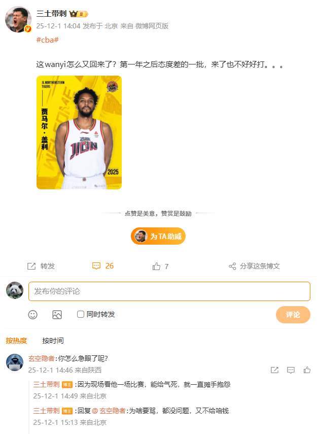 看到盖利重新回归CBA,媒体人三土带刺老师看不下去了,公开表示对他的不认可,“这wanyi怎么又回来了?第一年之后态度差的一批,来了也不好好打。”在与球迷的互动中,三土带刺老师更是直言,“因为现场看他一场比赛,能给气死,就一直摊手抱怨。”看到这里,有球迷就直说了,“不幸言中,比赛态度极差,毫无职业操守”。