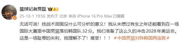 看到如此惨败,媒体人都忍不了了,篮球记者贾磊老师直言“无话可说”:“无话可说!技战术层面没什么可分析的意义!我从未想过有生之年还能看到在一场国际大赛里中国男篮落后韩国队32分。我们准备了这么久的冲击2028年奥运会。这是一场耻辱的失利,我理解不了!难受!”
