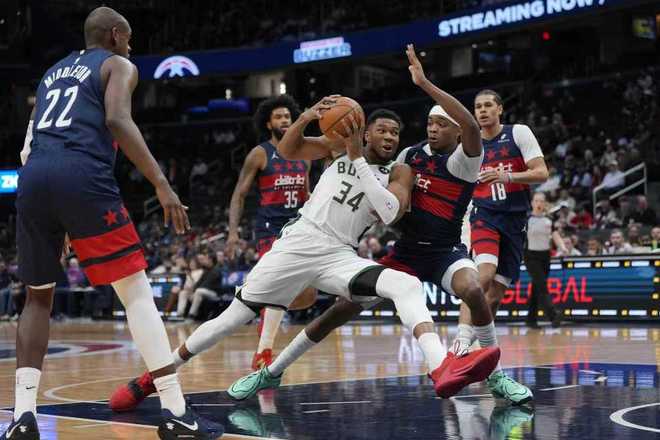 中场休息回来,雄鹿无缘连续三节得分30+,奇才则是连续两节单节轰下30+得分继续反扑追分。雄鹿一度扩大75-60领先优势,但奇才多点开花反扑追到仅差1分,雄鹿也是继续扩大优势,雄鹿单节28-33被追回5分,三节结束雄鹿被追到仅以94-91领先奇才3分。前三节比赛,雄鹿三分32中17超过5成准星,字母哥11中7得到17+5+4与小波特4记三分23+4+4,引领雄鹿5人得分上双;奇才三分28中7,麦科勒姆23分与巴格利18+6,引领奇才4人得分上双。