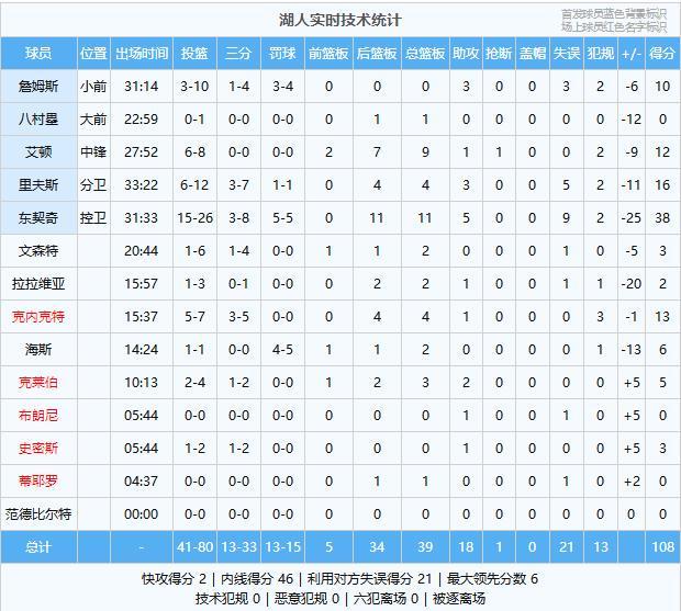 第二节开打湖人这边里弗斯、詹姆斯带队打,太阳这边吉莱斯皮带着4个替补应战,詹姆斯一上来就命中中距离,里弗斯传球失误克内克特赔上犯规,古德温大空位三分不中,文森特传球失误吉莱斯皮再次尝试三分还是铁,詹姆斯拿下篮板里弗斯篮下上篮命中可是被吹走步,吉莱斯皮中距离还是没有湖人失误连连太阳也没有把握住机会,里弗斯大空位三分把握住了,36-31湖人领先5分,古德温持球到内线撞倒了文森特被吹进攻犯规,第二节打了两分半钟太阳一分没得,机会都出来了就是没把握住!回到比赛太阳主力慢慢回到场上,布耶反击上篮命中,狄龙翻身跳投也有,克内克特三分帮助湖人稳住局面,里弗斯运球又失误,太阳继续进攻狄龙翻身跳投再中比分追到37-41!拉拉维亚传球失误古德温第四次三分出手把握住了,东契奇打板不中马威反击暴扣, 太阳42-41反超了!