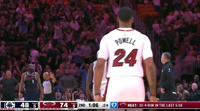 46-47,鲍威尔投进三分之后,泰伦-卢喊出暂停。随后比分一路来到46-64,热火打出一波高潮,算上叫暂停前的那个三分,一波20-0。这还没完,鲍威尔的手感炸裂连续命中三分,这波进攻高潮最疯狂的时候达到了32-4。