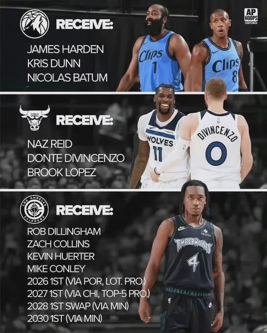 森林狼得到哈登、巴图姆、邓恩;公牛得到里德、迪温琴佐、大洛佩慈;快船得到迪林厄姆、扎克-柯林斯、赫尔特、康利、26年首轮、27年首轮签、28年首轮互换、30年首轮。