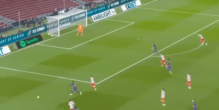 第65分钟,佩德里直塞,莱万吸引多人牵制,奥尔莫禁区推射远角破门,2:1!久攻之下的巴萨,终于反超比分。拉菲尼亚、佩德里、莱万全部被换下,弗里克明显要加强防守了。第78分钟,阿尔马达禁区晃过多名防守球员,包括霍安加西亚,几乎面对空门的情况下,直接打飞了!