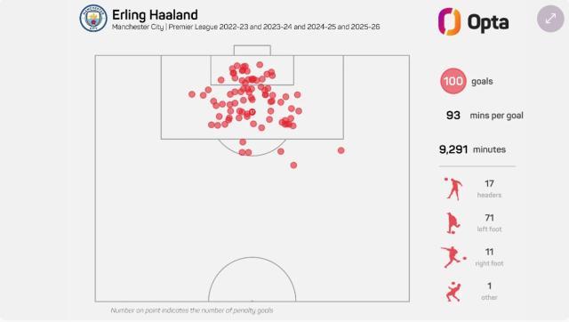 数解哈兰德:25岁英超百球疯,30岁英超史一锋!