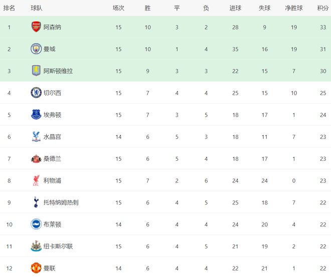 在积分榜上,阿森纳总积分依然是33分,排名榜首,但是优势已经所剩无几了。曼城赢球之后,总积分达到31分,排名第2,只比阿森纳少2分。阿斯顿维拉30分排名第3。第4的是切尔西,拿到25分。埃弗顿24分排名第5。水晶宫、桑德兰和利物浦都是23分。