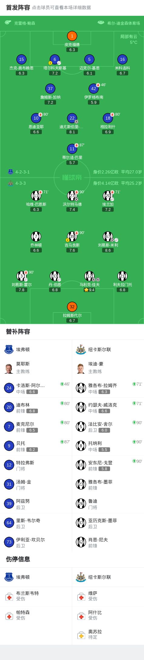 北京时间11月30日英格兰足球顶级联赛 联赛 第13轮,埃弗顿主场对阵纽卡斯尔联。埃弗顿迪尤斯伯里-霍尔破门。纽卡斯尔联马利克-佳夫梅开二度,刘易斯-米利破门,沃尔特马德破门。最终比分埃弗顿 1-4 纽卡斯尔联。