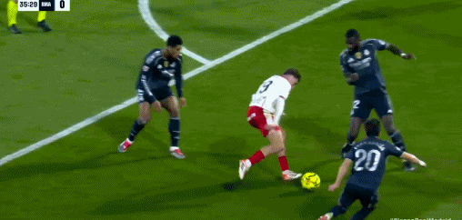 第45分钟,打破僵局,欧纳希劲射得分,皇马0-1